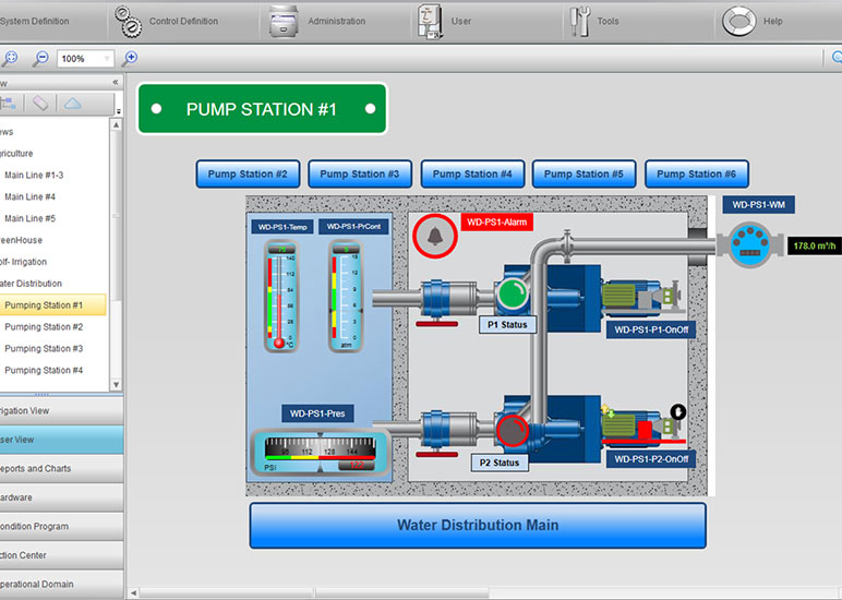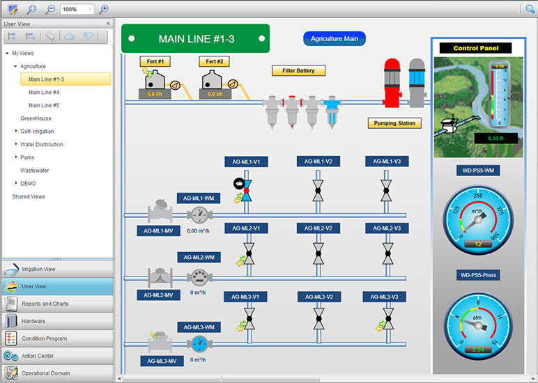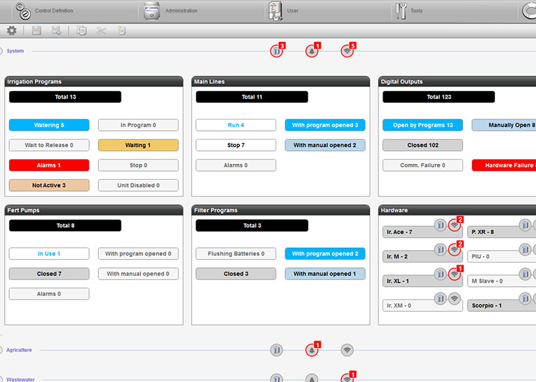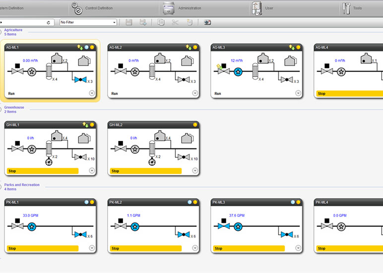 The ICC PRO software provides a reliable, centralized & remote irrigation control platform which communicates with all the system’s components while monitoring and controlling all relevant sites. It provides real-time status reporting of all irrigation, fertilizer pump stations and enables accurate operation of the irrigation programs and schedules. At the same time this user-friendly platform provides constant monitoring and performance analysis of all equipment components. It is designed for multiple simultaneous users, the access to information is restricted to authorized and authenticated users through flexible multi-level password authorization from an entire system down to a single element level.